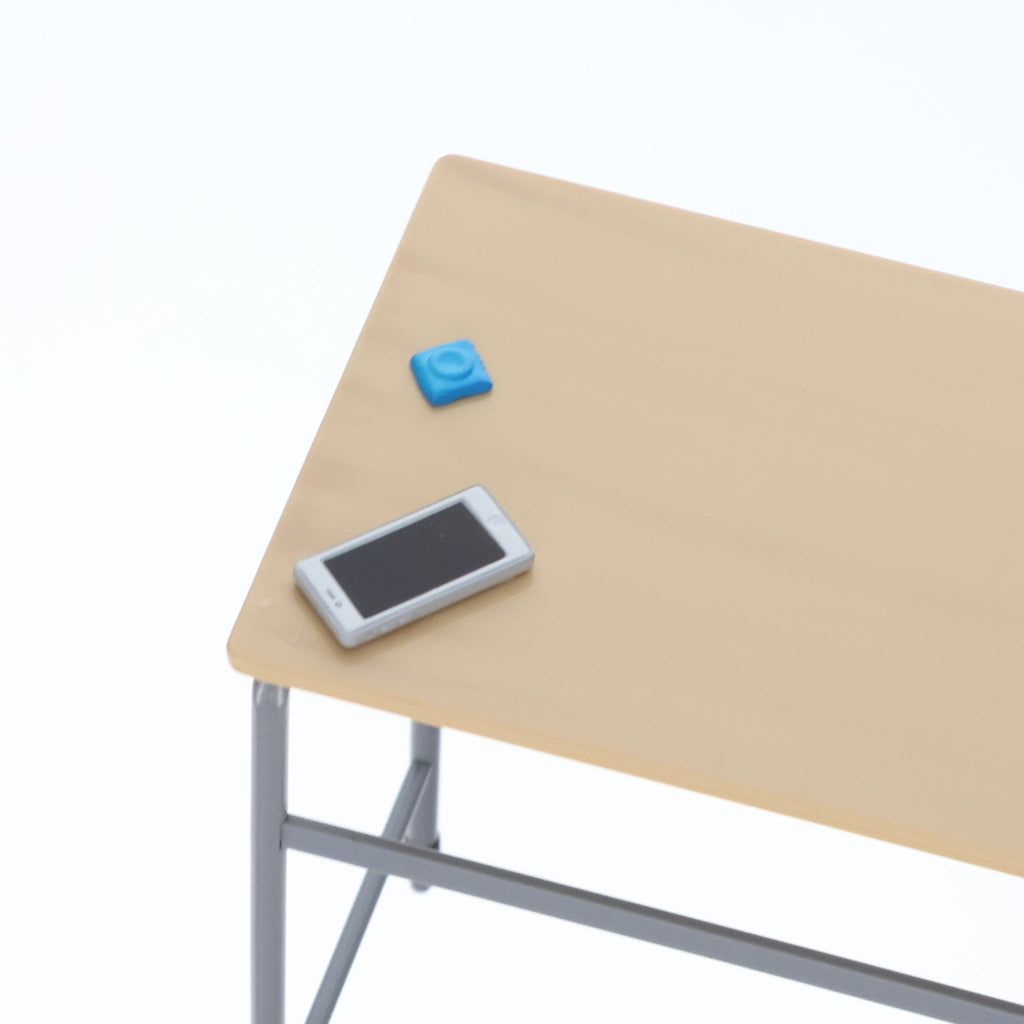 正確に再現された学校机にはスマホとコンドームも置かれています。