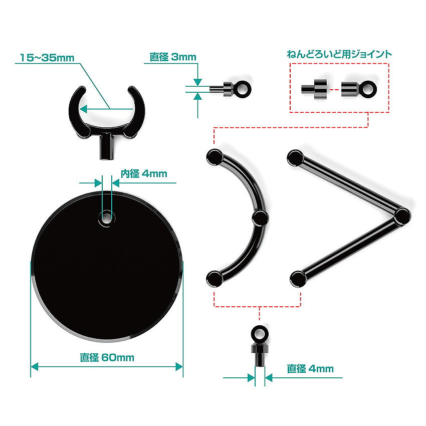 挟み込むクリップ型の固定パーツと、ねんどろいどに対応した(※)六角ピンも付属します。