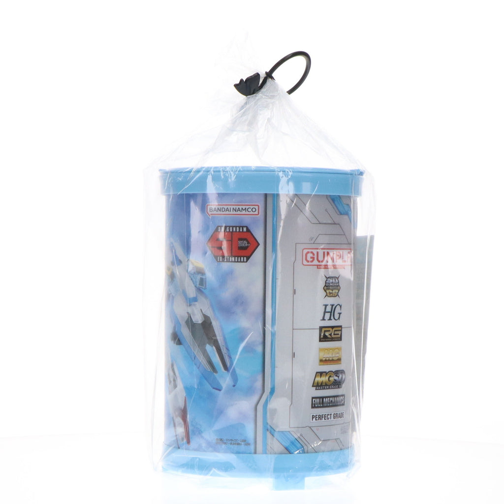円筒形の蓋付きボックスにガンプラと菓子をセットした商品です。