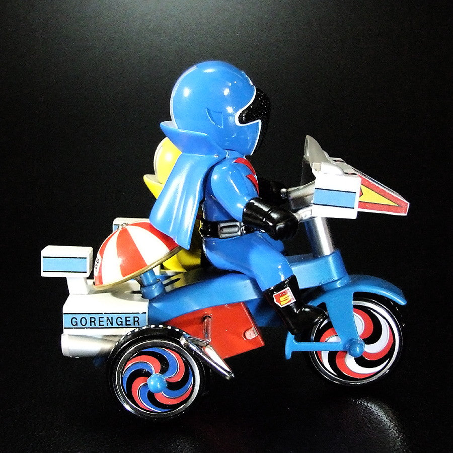 「秘密戦隊ゴレンジャー」に登場するキャラクターたちが、懐かしくレトロなゼンマイ式三輪車に乗ったソフビフィギュアで登場!!
