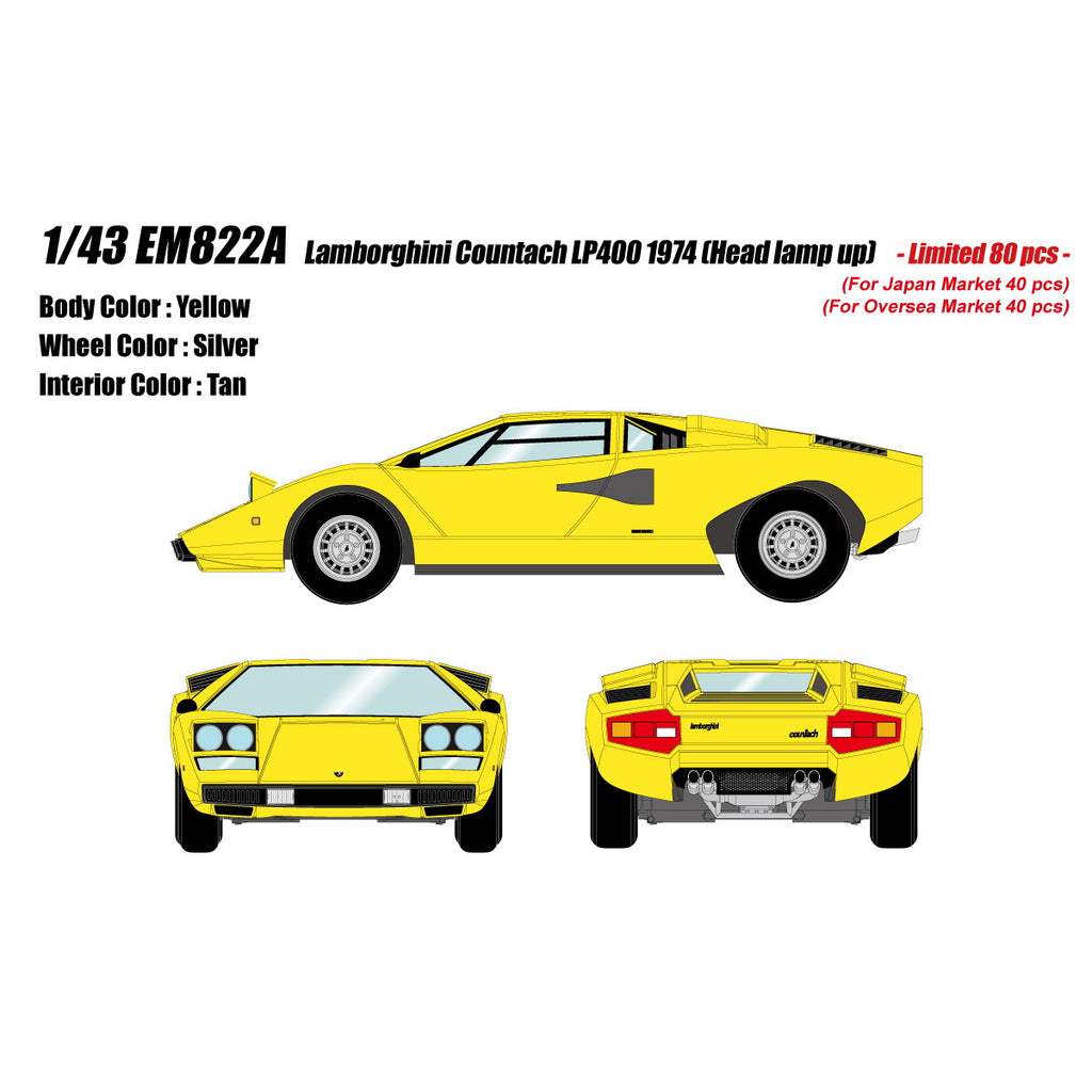 ■タイトル:1/43 Lamborghini Countach(ランボルギーニ カウンタック) LP400 1974 Head lamp open イエロー 完成品 ミニカー(EM822A) EIDOLON(アイドロン)