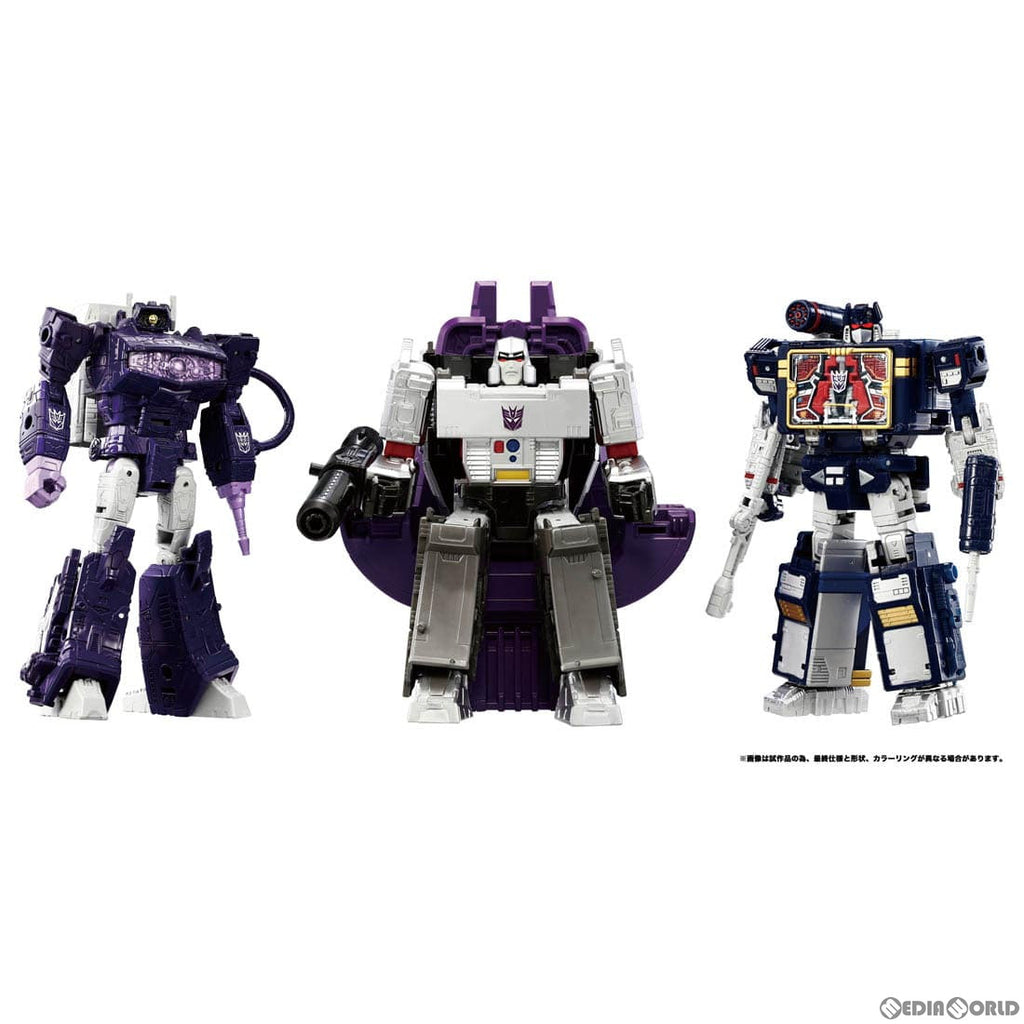 ディセプティコンの宇宙戦艦ネメシスのブリッジにあるキャプテンシートに鎮座するディセプティコンの破壊大帝メガトロンと、その両脇を固める幹部2名ショックウェーブとサウンドウェーブをイメージしたスペシャル情景セットです。