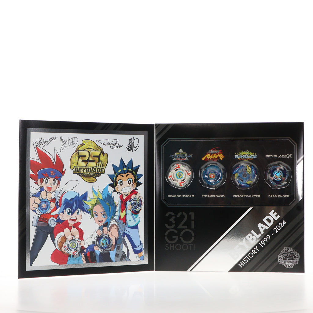 「爆転シュート ベイブレード」から「ドラグーンストーム4-60RA」、「メタルファイト ベイブレード」から「ストームペガシス3-70RA」、「ベイブレードバースト」から「ビクトリーヴァルキリー2-60RA」、「BEYBLADE X」から「ドランソード3-60F ホロステッカーVer.」のセット。